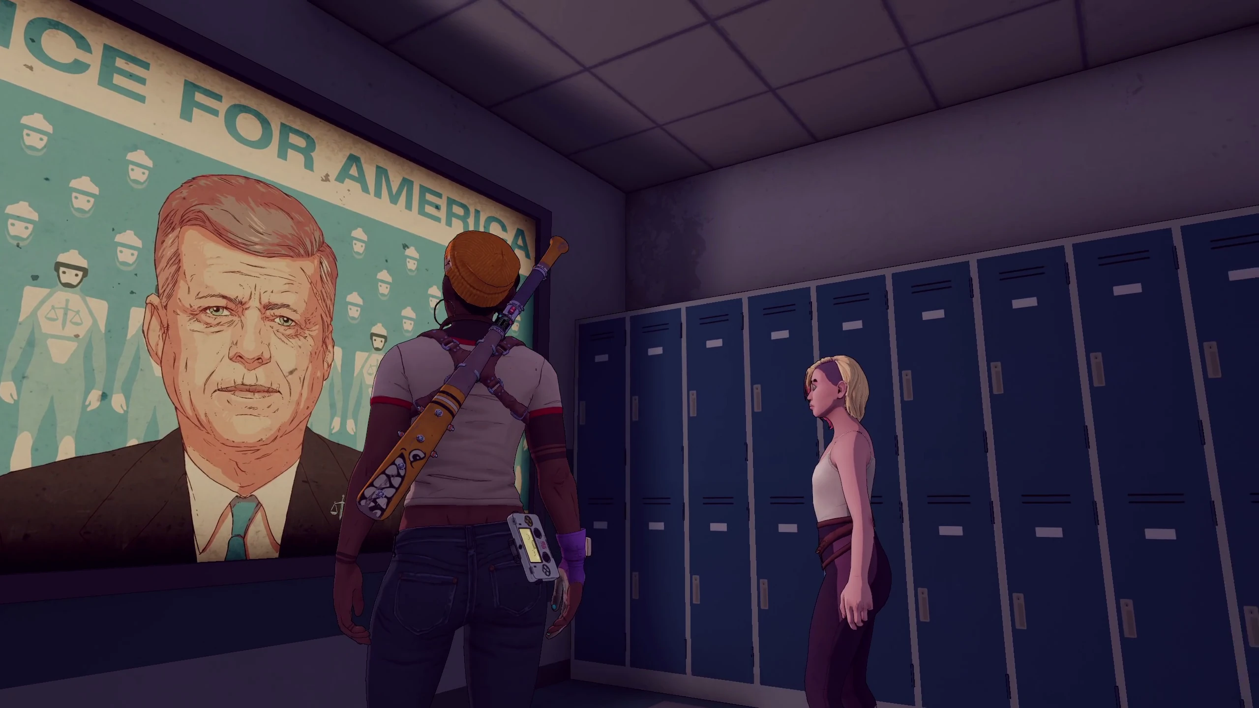 Once the elevator reaches its destination, Pax and Ziggy find themselves in a school hallway full of lockers and classrooms. Ziggy brings up several Justice conspiracy theories she heard, such as Justice's creation of the Broadcast, Justice kidnapping children for experimentation, and JFK still being alive, though Pax will remark that the last one is unlikely. Pax can take note of a large poster of John F. Kennedy, prompting Ziggy to state that JFK would never approve of Justice's current tyranny, though Pax thinks otherwise. The duo goes through several classrooms in order to bypass the rubble in the hallways, all while finding some deactivated robots. Ziggy takes a short break and opens up to Pax about her phobias and resentment of being abandoned, giving the two a chance to improve their relationship.